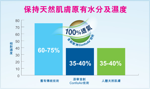 對比使用一般傳統透氣技術的紙尿片,使用ConfioAir™技術的添寧透氣棉柔成人紙尿片後,皮膚濕度約低2倍,有效保持天然肌膚原有水分及濕度,感受2倍乾爽舒適。[3]